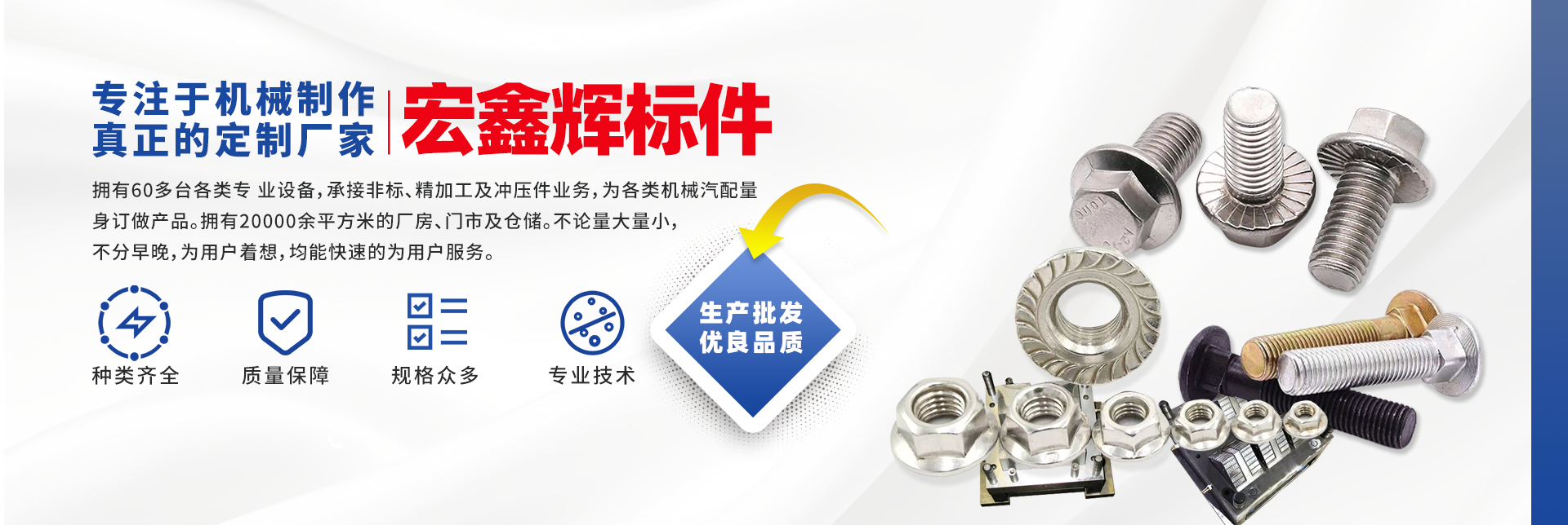四川宏鑫輝標準件制造有限公司下設(shè):南充市宏輝機械制造有限公司,南充市聚宏機電設(shè)備有限公司,公司始建于1994年。為了拓展市場,降低成本,本公司于2007年、2020年分別在南充、 成都、重慶創(chuàng)建了生產(chǎn)基地。擁有60多臺各類專 業(yè)設(shè)備,承接非標、精加工及沖壓件業(yè)務(wù),為各 類機械汽配量身訂做產(chǎn)品。擁有20000余平方米的廠房、門市及倉儲。公司以誠信為本,竭誠為廣大客戶提供服務(wù)。不論量大量小,不分早晚,為用戶著想,均能快速的為用戶服務(wù)。 公司所生產(chǎn)及代理的產(chǎn)品為業(yè)界人士公認的國內(nèi)、國際優(yōu)等品牌。在產(chǎn)品性能與質(zhì)量